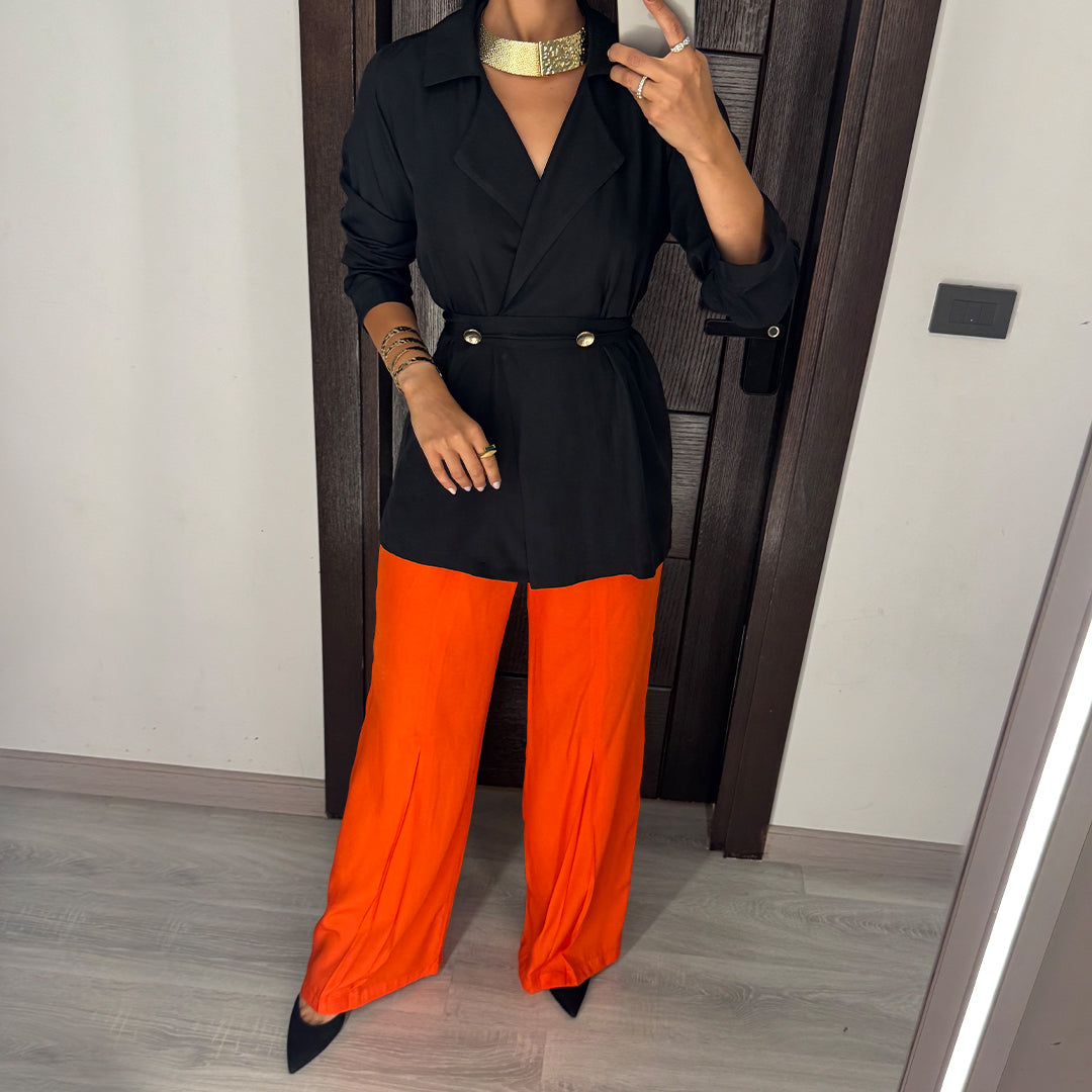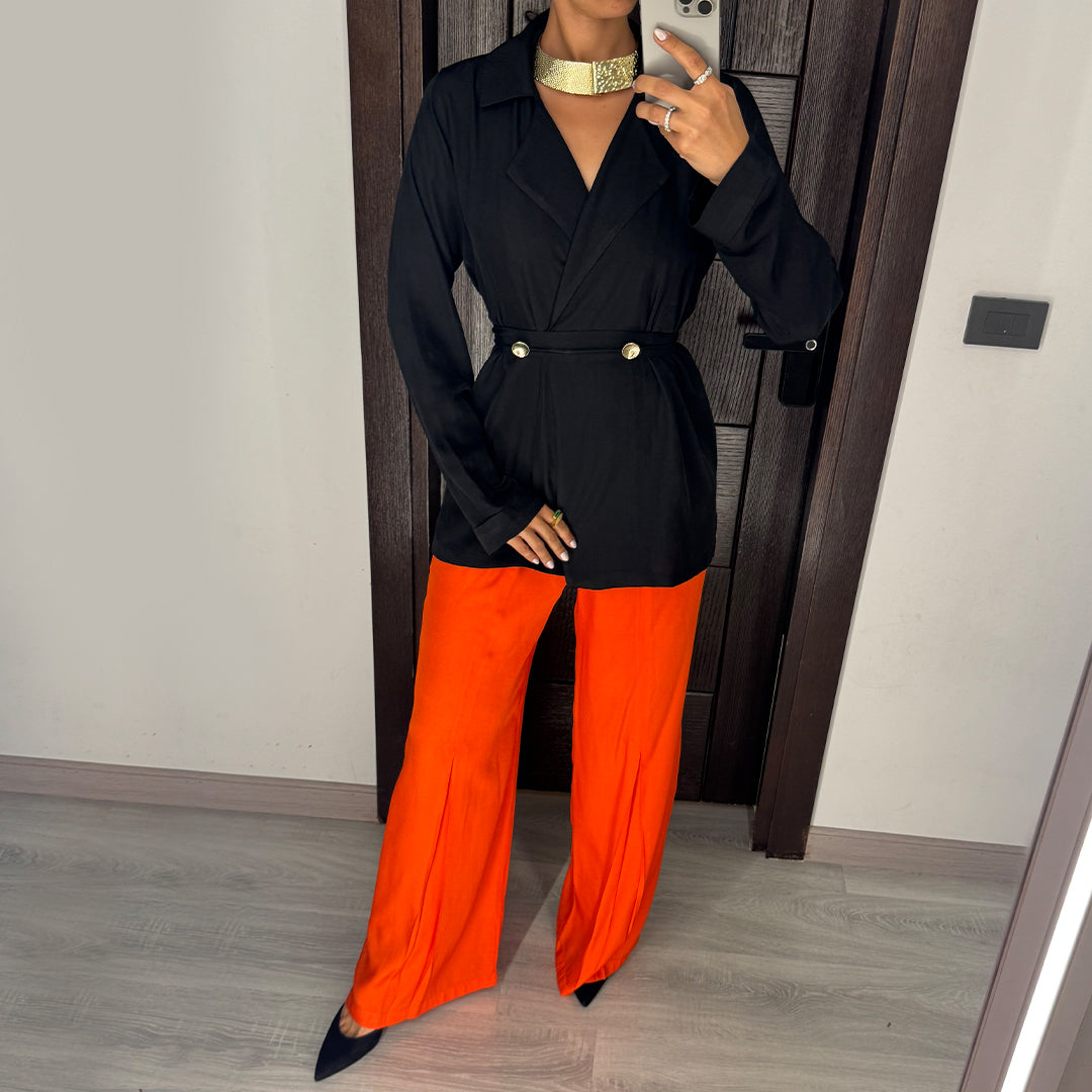 Black & Orange Satin Voile Wide-Leg Set